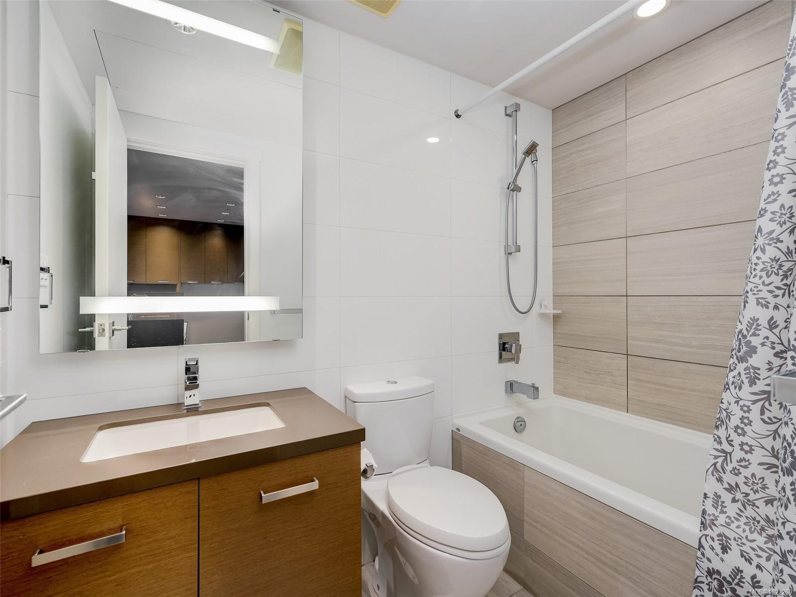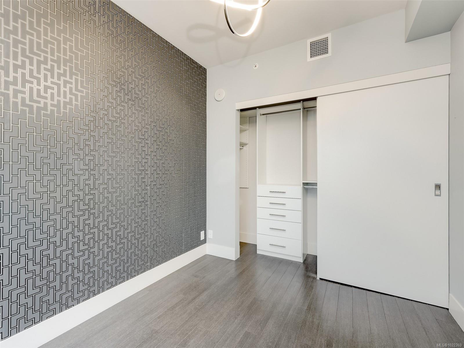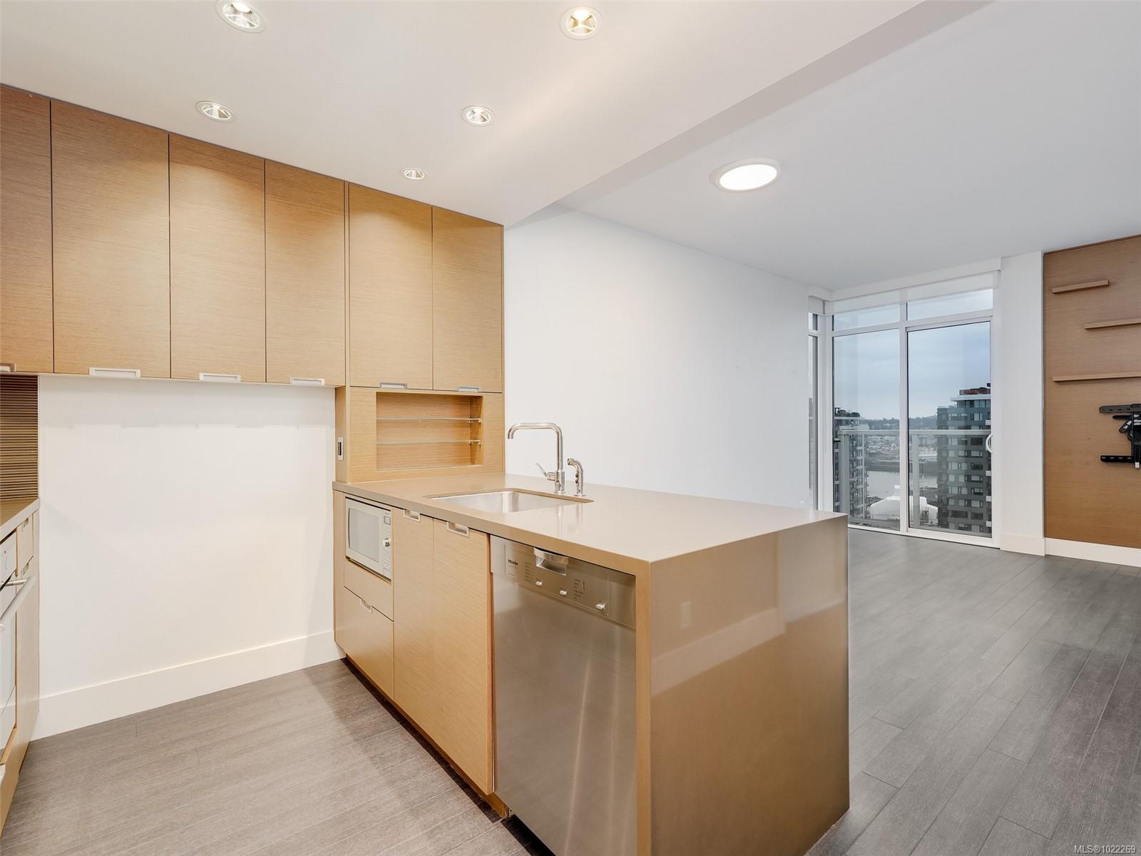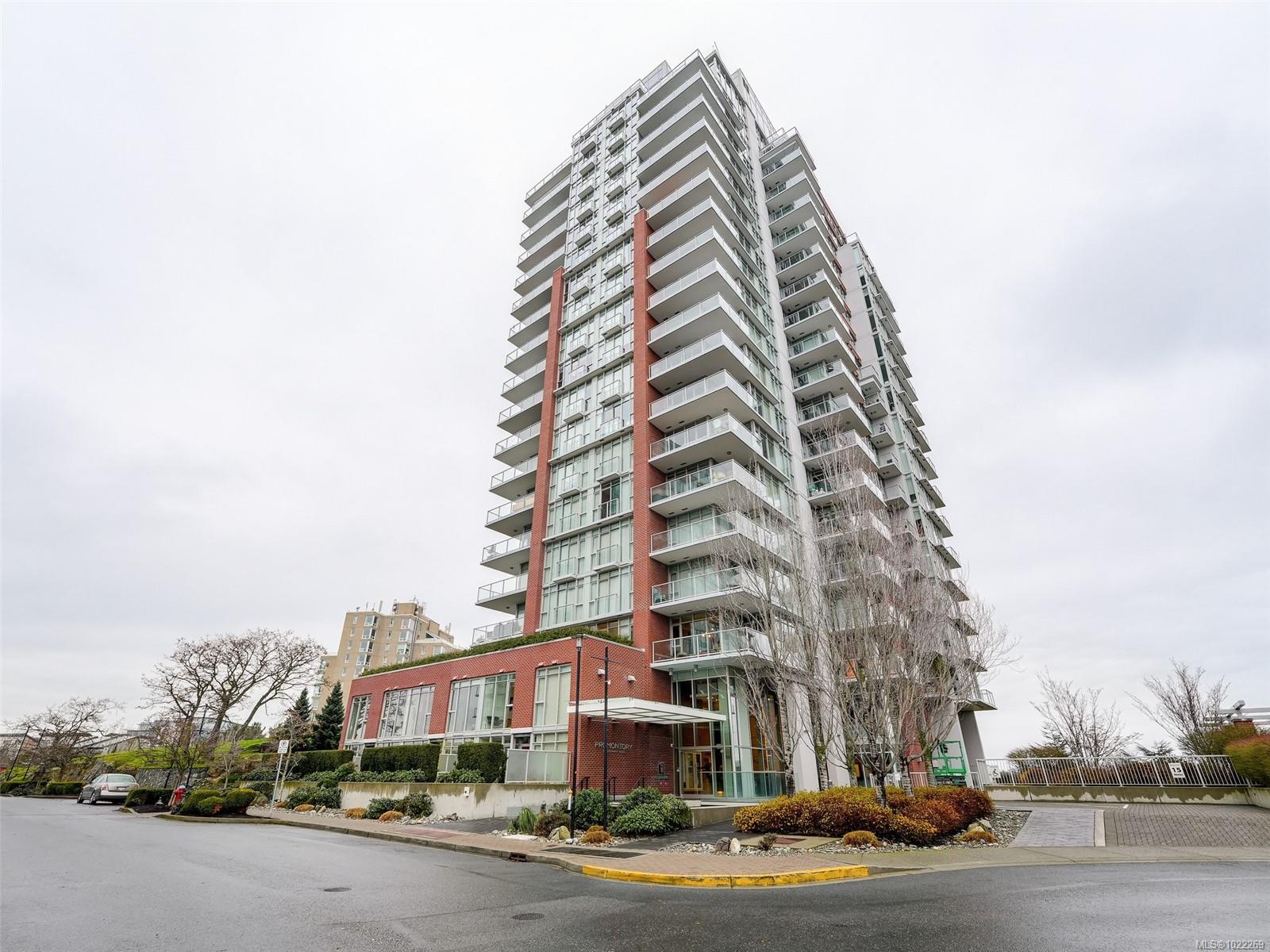 Experience stunning panoramic views from this bright, modern 1 bed, 1 bath condo on the 10th floor of the iconic Promontory at Bayview Place. Floor-to-ceiling 9' windows frame breathtaking vistas of the city, the Gorge, and even Mt. Baker on clear days. Enjoy sunrises from your east-facing balcony, with both north and south exposure adding dynamic light and views all day long. The open-concept layout features a gourmet kitchen with quartz waterfall countertops, SS appliances, and gas stove. Custom built-ins (in the living room, kitchen, and bedroom) and updated lighting exemplify the pride of ownership of the space. Live minutes from downtown in sought-after Vic West. Building amenities include A/C, in-suite laundry, parking, storage locker, concierge, fitness centre, bike storage, and a stylish lounge with kitchen, fireplace, and BBQ patio. Pet-friendly and move-in ready—luxury living awaits in one of Victoria’s tallest buildings. Come see why Promontory is a standout in the skyline!